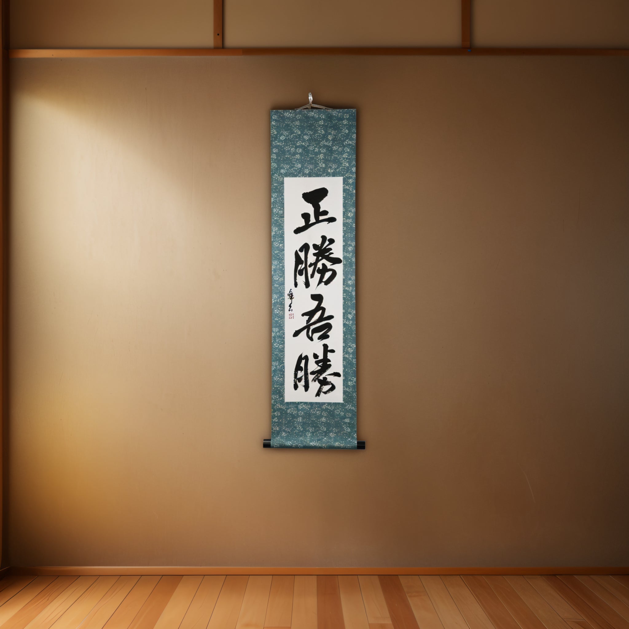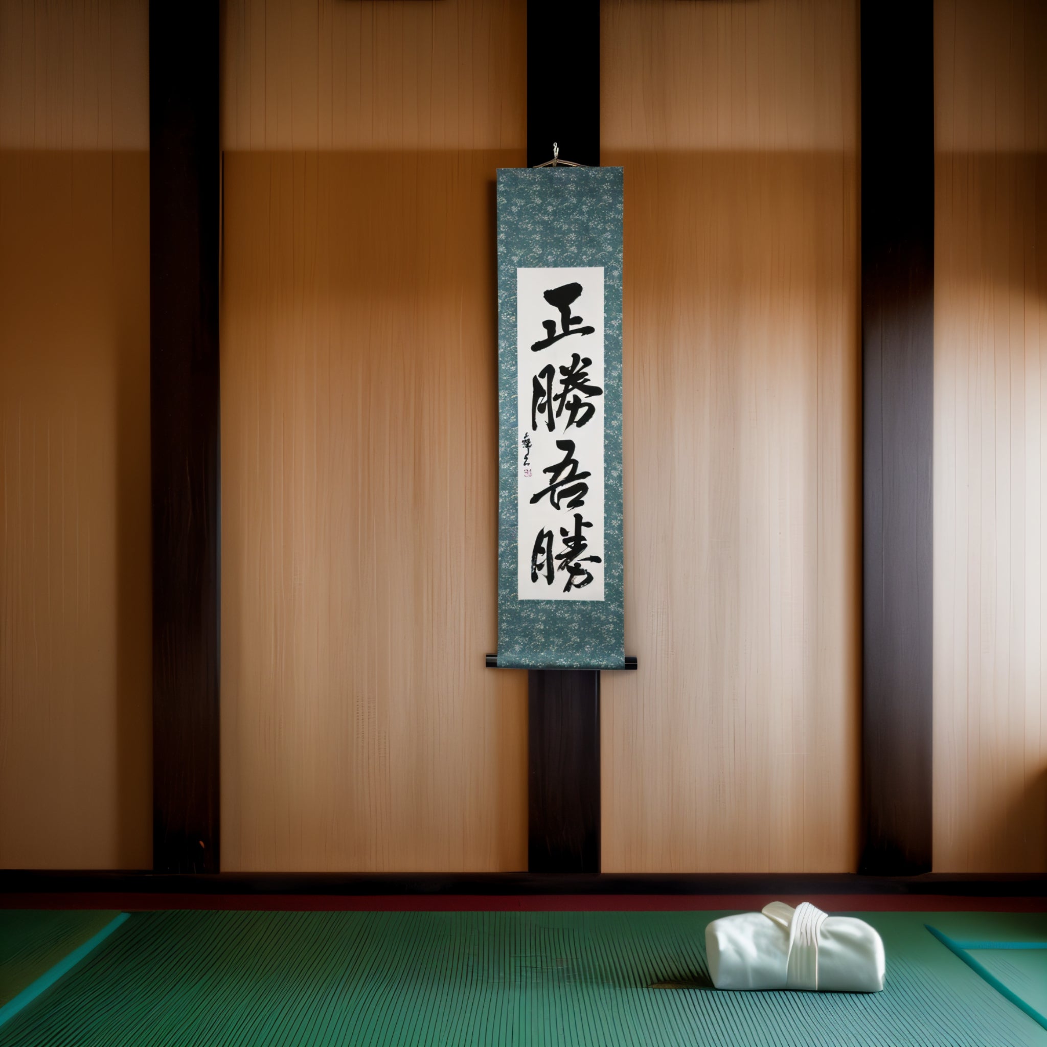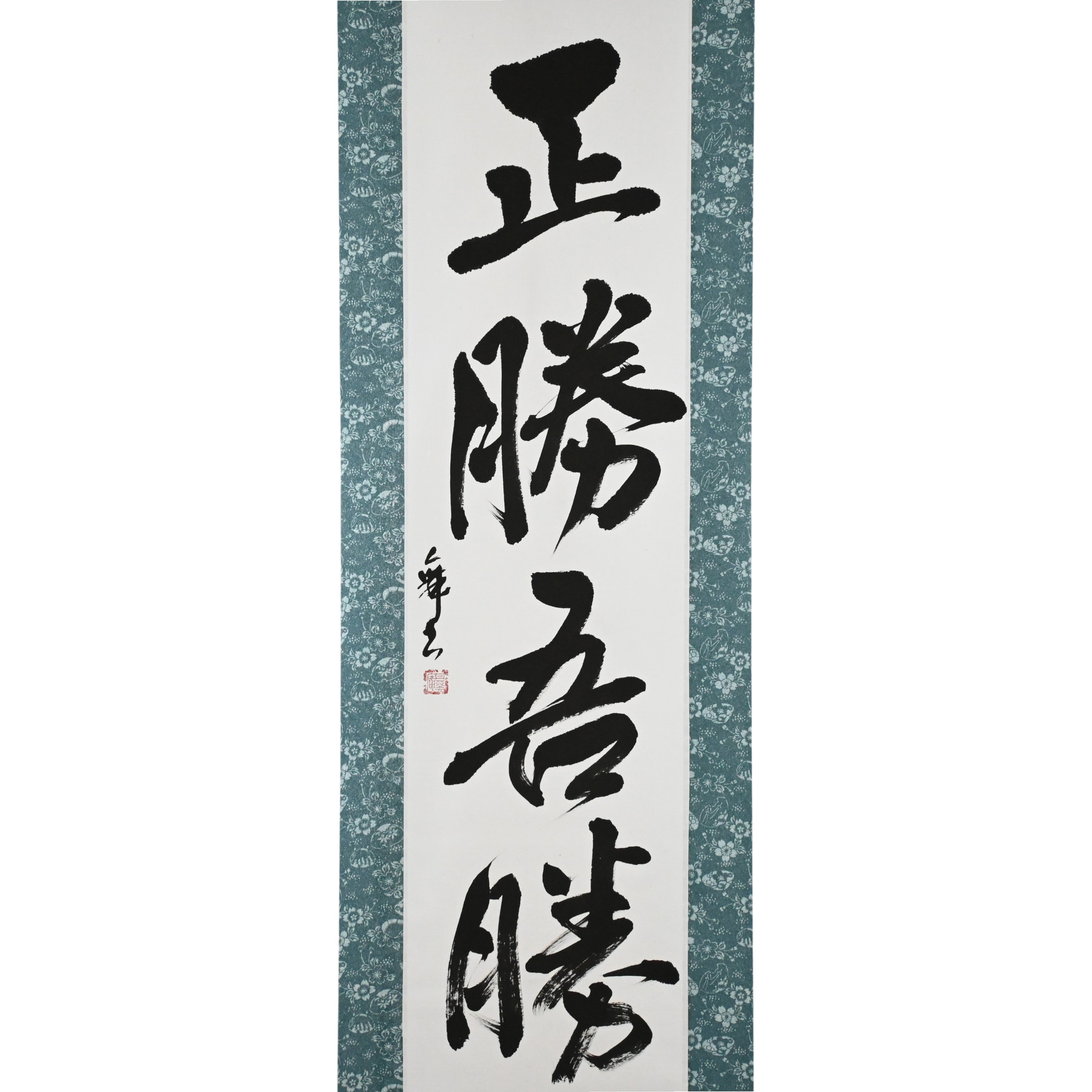 This Japanese calligraphy scroll presents the powerful phrase 正勝吾勝 (Masakatsu Agatsu), a principle embodying the indomitable spirit of victory and unwavering determination that resonates deeply in Karate, Judo, and Aikido.