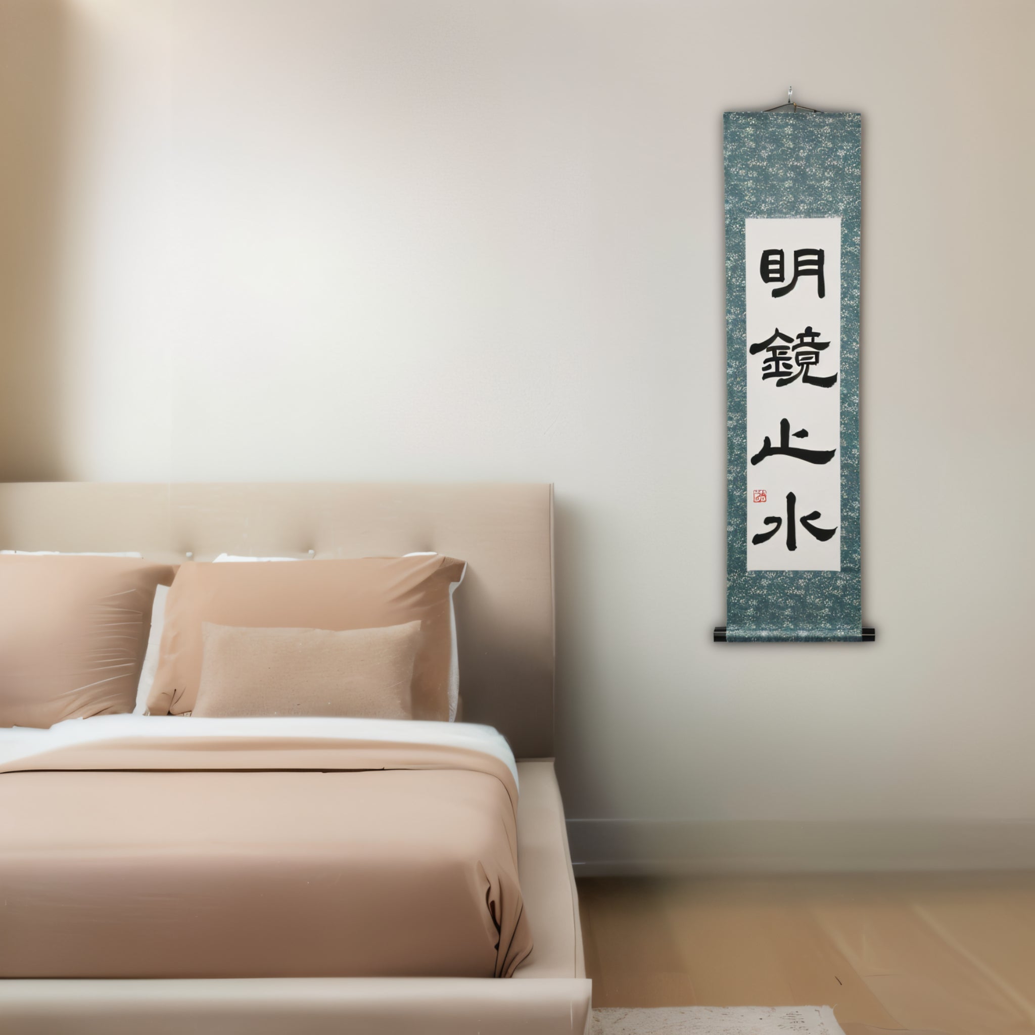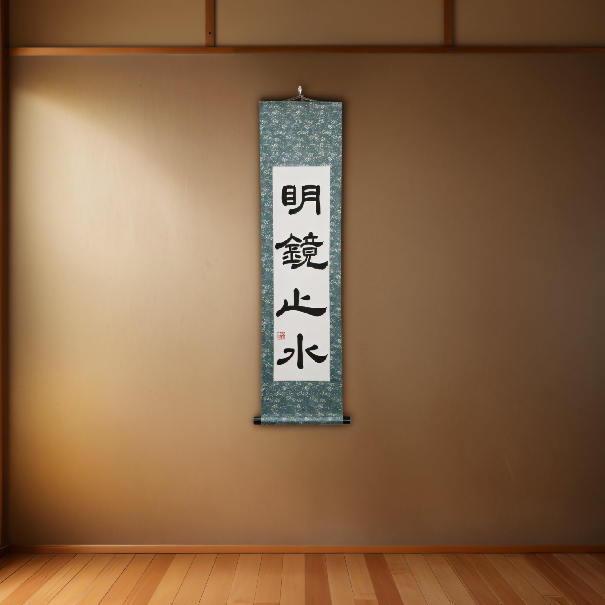 This Japanese calligraphy scroll features the serene phrase 明鏡止水 (Meikyō Shisui) — a state of mind compared to a spotless mirror and a perfectly still body of water. It represents clarity, inner calm, and the quiet strength that arises when the heart is free from noise and distraction.