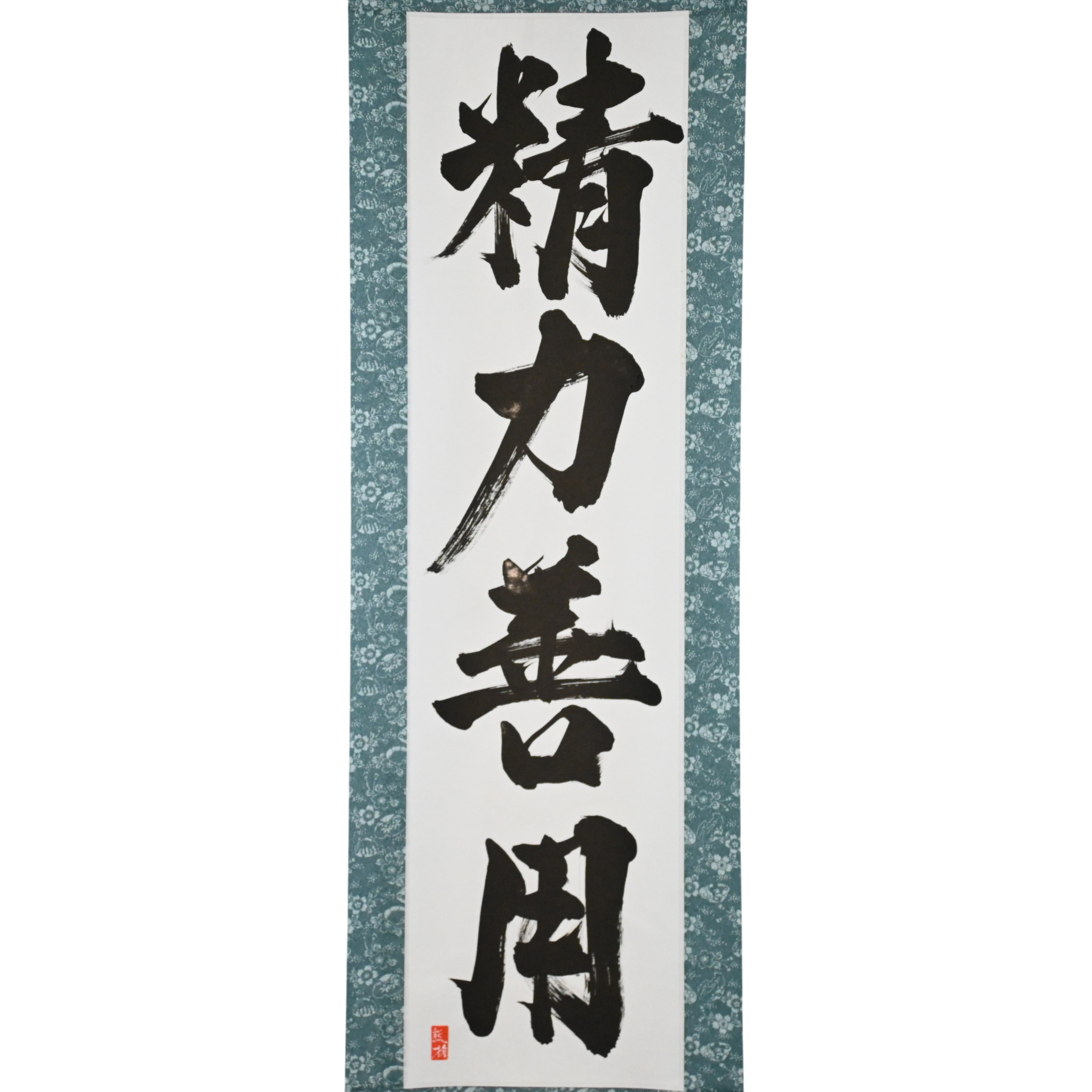 This Japanese calligraphy scroll features the timeless phrase 精力善用 (Seiryoku-Zenyō) — translated as "Maximum Efficient Use of Energy". It is one of the two core principles of Judo, alongside 自他共栄 (Jita-Kyōei, "Mutual Welfare and Benefit"), both established by Judo’s founder, Jigoro Kano (嘉納治五郎).